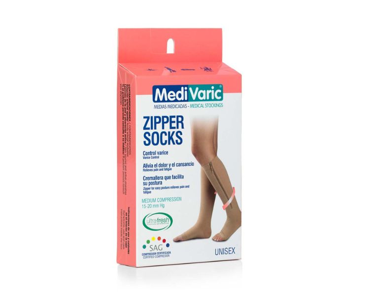 Las medias de compresión mediana con cierre o cremallera Zipper Socks previenen las venas várices y estimulan el descanso en las piernas ayudando a controlas las Telangiectasias o arañitas. Mejora considerable en la circulación y el retorno venoso. Ayudan a reducir la hinchazón de las piernas. Especiales para tratamiento y control de venas várices. Tejido resistente con hilos importados. Sensación de suavidad al tacto. Elimina síndrome de piernas cansadas.